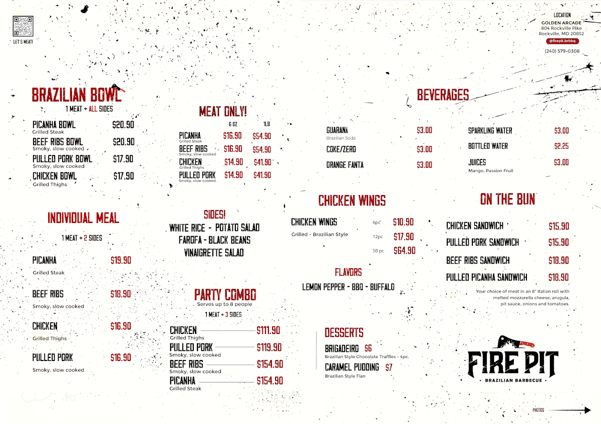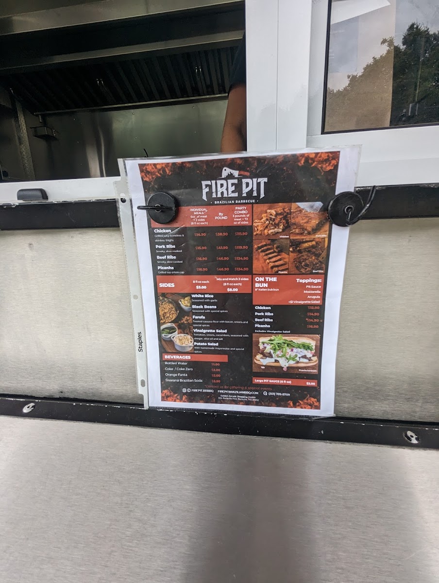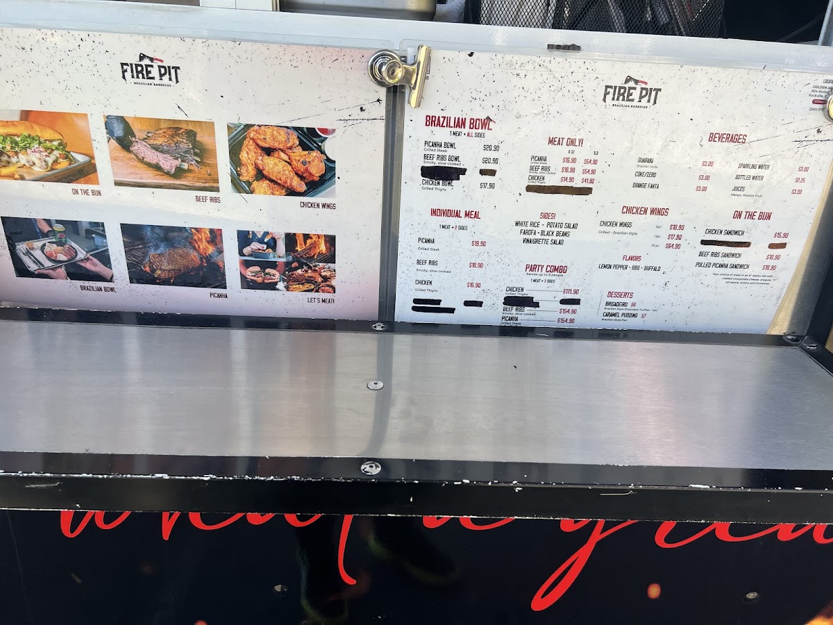 From a reviewer’s perspective, the menu at Fire Pit Brazilian Barbecue Food Truck offers a satisfying range of hearty, meat-focused options that highlight Brazilian flavors with simple, customizable choices. The Picanha Bowl, Beef Ribs Bowl, and Chicken Bowl provide convenient, well-rounded meals, while the Picanha + 2 Sides, Beef Ribs + 2 Sides, and Chicken + 2 Sides options allow for a more personalized plate. Sandwich lovers can enjoy items like the Picanha Sandwich, Pulled Picanha Sandwich, Beef Ribs Sandwich, and Chicken Sandwich, all served “on the bun” for a casual bite. The wings selection-Wings 6 Pc, Wings 12 Pc, and Wings 50 Pc-caters to both individuals and groups, while classic sides such as White Rice, Black Beans, Farofa, Potato Salad, and Vinaigrette Salad complement the smoky meats perfectly. For those wanting just protein, choices like 1 Pound Of Picanha, 6oz Picanha, 1 Pound Of Beef Ribs, 6oz Beef Ribs, and 1 Pound Of Chicken are available. The flexible MIX AND MATCH (3 sides) option enhances variety, and desserts like Brigadeiro and Brazilian Caramel Pudding add a sweet finish. Drinks such as Guarana, Guarana Zero, Coca-Cola, Coca-Cola Zero Sugar, and Fanta Orange round out the experience, while larger gatherings are well-served by the 3 Pounds Of PICANHA + Mix And Match Sides, 3 Pounds Of CHICKEN + Mix And Match Sides, and 3 Pounds Of BEEF RIBS + Mix And Match Sides party combos. Overall, the menu is straightforward yet satisfying, emphasizing quality grilled meats and classic Brazilian accompaniments.
