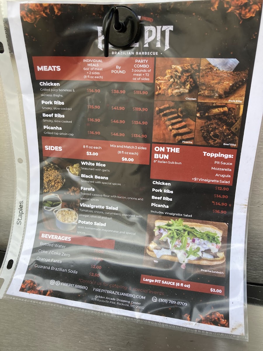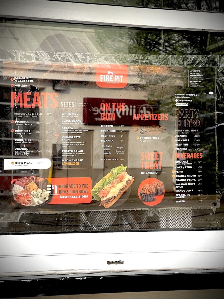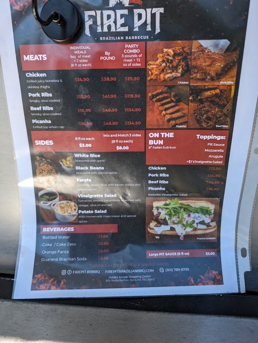 From a reviewer’s perspective, the menu at Fire Pit Brazilian Barbecue Food Truck offers a satisfying range of hearty, meat-focused options that highlight Brazilian flavors with simple, customizable choices. The Picanha Bowl, Beef Ribs Bowl, and Chicken Bowl provide convenient, well-rounded meals, while the Picanha + 2 Sides, Beef Ribs + 2 Sides, and Chicken + 2 Sides options allow for a more personalized plate. Sandwich lovers can enjoy items like the Picanha Sandwich, Pulled Picanha Sandwich, Beef Ribs Sandwich, and Chicken Sandwich, all served “on the bun” for a casual bite. The wings selection-Wings 6 Pc, Wings 12 Pc, and Wings 50 Pc-caters to both individuals and groups, while classic sides such as White Rice, Black Beans, Farofa, Potato Salad, and Vinaigrette Salad complement the smoky meats perfectly. For those wanting just protein, choices like 1 Pound Of Picanha, 6oz Picanha, 1 Pound Of Beef Ribs, 6oz Beef Ribs, and 1 Pound Of Chicken are available. The flexible MIX AND MATCH (3 sides) option enhances variety, and desserts like Brigadeiro and Brazilian Caramel Pudding add a sweet finish. Drinks such as Guarana, Guarana Zero, Coca-Cola, Coca-Cola Zero Sugar, and Fanta Orange round out the experience, while larger gatherings are well-served by the 3 Pounds Of PICANHA + Mix And Match Sides, 3 Pounds Of CHICKEN + Mix And Match Sides, and 3 Pounds Of BEEF RIBS + Mix And Match Sides party combos. Overall, the menu is straightforward yet satisfying, emphasizing quality grilled meats and classic Brazilian accompaniments.